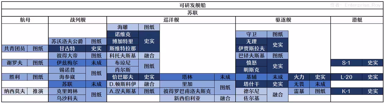 纳西莫夫:Wargaming声称纳西莫夫为苏联级战列舰的航改方案,由于缺乏足够史料支撑,故认定为Wargaming推演产物。