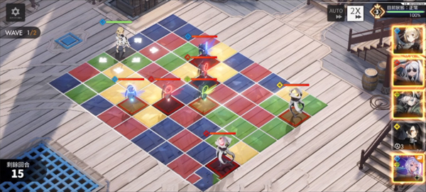 操控谱面上的角色经过相同的色块,角色能够在周围八个格子中任选其一作为前进方向。当你所经过色块的附近存在敌方单位时,与格子底色属性相同的角色,会对敌人造成格子倍率乘以白字的伤害。此外,队长不受格子底色判定的限制,无论属性是否相同,都能对敌人造成伤害。