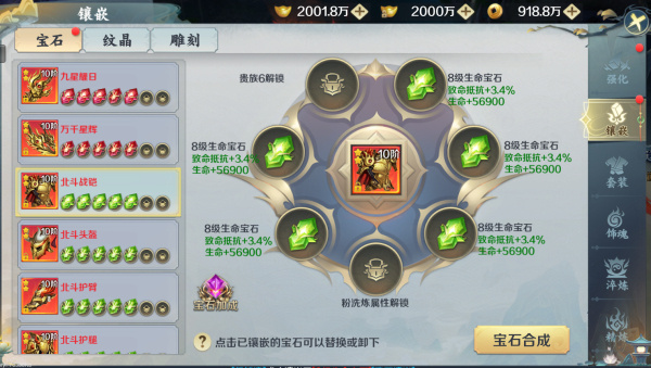 当然除了镶嵌宝石这个功能之外,还能进行宝石合成来提升你宝石的等级(3合1),在你提升到一定等级之后你可以获得新增的属性。