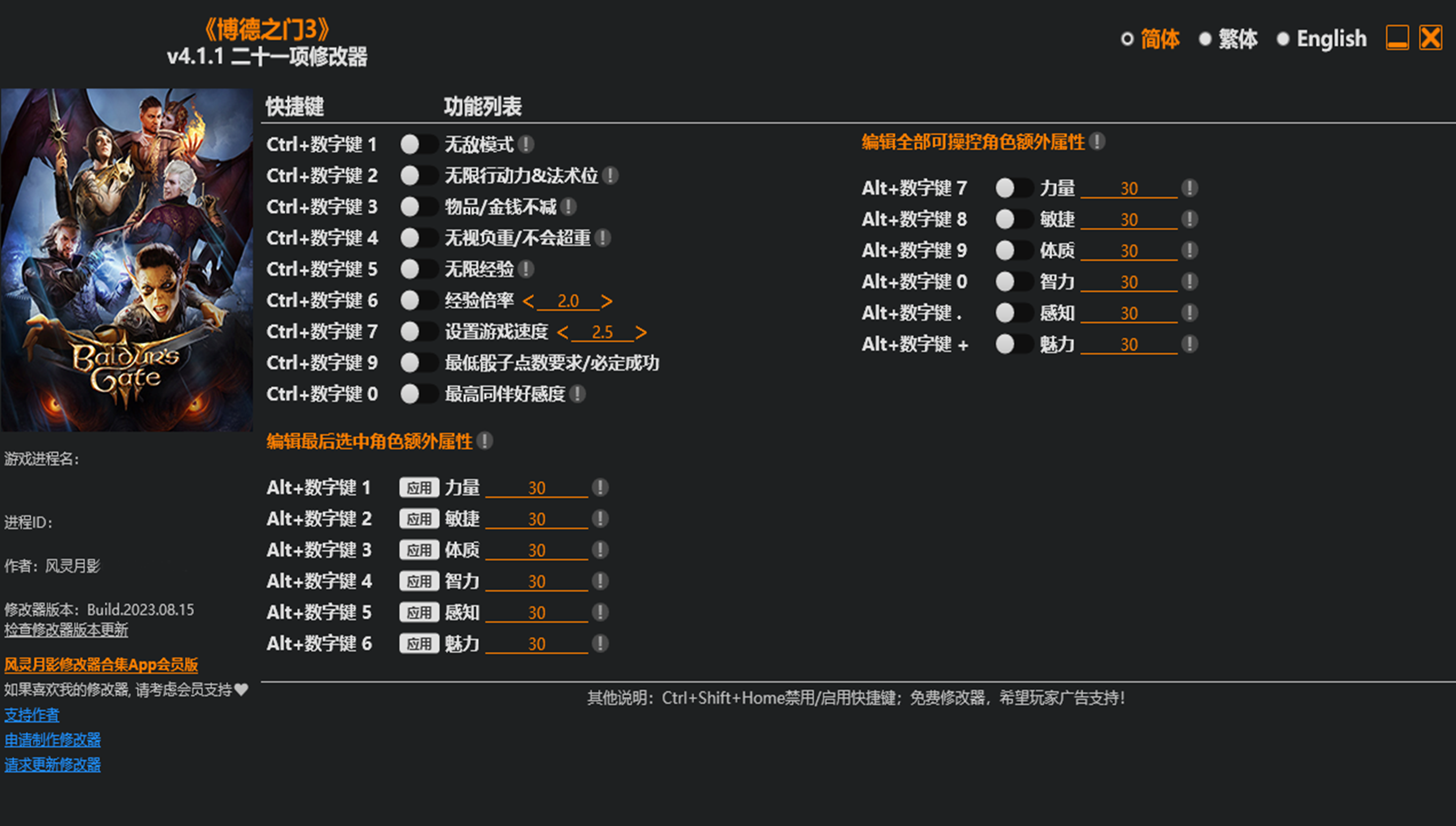 博德之门3二十一项修改器功能全面,使用方便,玩家可以在这里可以无限的拾取物品,不会超重。还有各种角色数值的编辑功能,角色的力量,敏捷,体质,智力,都能编辑,数值随心改变,变强将会是一件容易的事情,感兴趣的小伙伴,点击下载感受吧。