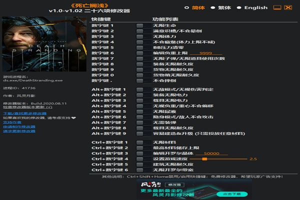 死亡搁浅二十六项修改器是由风灵月影制作的一款非常好用的修改器,功能多样,这里你可以实现角色的无限体力,能够永远不知疲惫。还能对负重的上限进行编辑,各种物品,例如子弹等,都是无限的数量,感兴趣的小伙伴,点击下载感受吧。