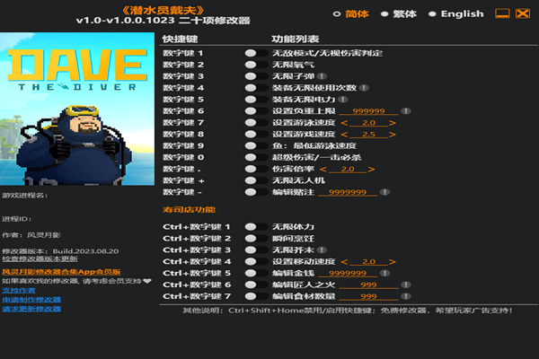 潜水员戴夫修改器(附说明)氛围一般的按键功能以及对寿司店的编辑功能,玩家可以在潜水中获得无限的氧气,让鱼用最低限度进行游泳。针对寿司店,可以无限制的提供芥末,提供瞬间烹饪的功能,感兴趣的小伙伴,点击下载感受吧。