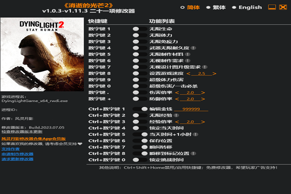 消逝的光芒2修改器二十一项能给玩家带来众多十分惊喜的游戏体验,不仅可以无视各种制作要求,还能提高武器的耐久度,永远都不会损坏。伤害的能力和防御力得到极大的提升,感兴趣的小伙伴,点击下载感受吧。