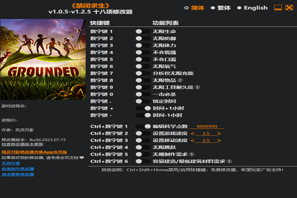 禁闭求生18项修改器将会成为你在游戏中变小之后最大的依仗,不仅可以为你提供强大的战力,任何生物都能一击必杀。还能锁定时间,便捷科学点数,无限的氧气和工具的无限耐久,无需修复非常好用,感兴趣的小伙伴,点击下载感受吧。