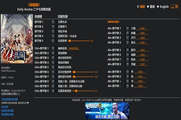 侠隐阁二十七项修改器非常好用,风灵月影出品,必属精品。玩家可以通过修改器进行进金钱的编辑,更改游戏中npc对你的好感度,提升自己的各种属性,快速成为一名战力无双的大侠,感兴趣的小伙伴,点击下载感受吧。
