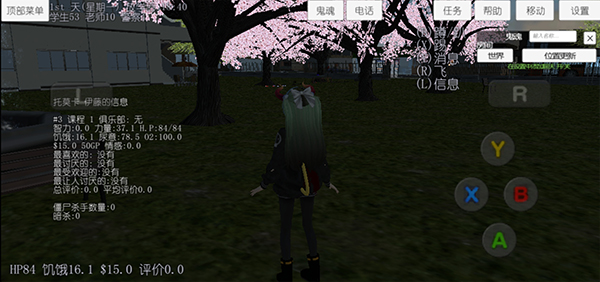 玩法:很普通的玩法,无僵尸模式,照着课表上课,吃东西,上社团活动,加入或退出社团,和学生老师互动,攻略学生并和学生恋爱,爬山玩水,开车等。