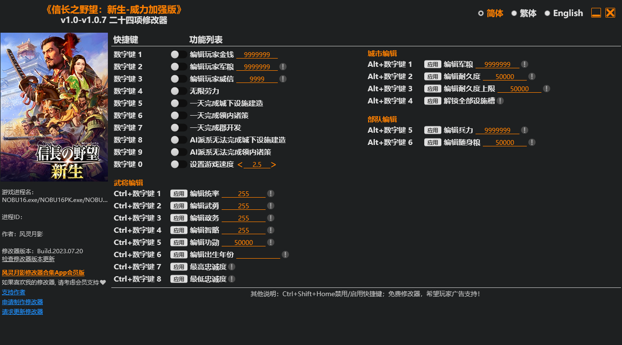 信长之野望16多功能修改器是一款功能非常全面的修改器,大幅缩短了各种建造的时间,让您可以迅速完成各种复杂的任务。可以自由编辑金钱和军粮,还可以一键将威信升至满级,展现出自己的领导力和信任度。
