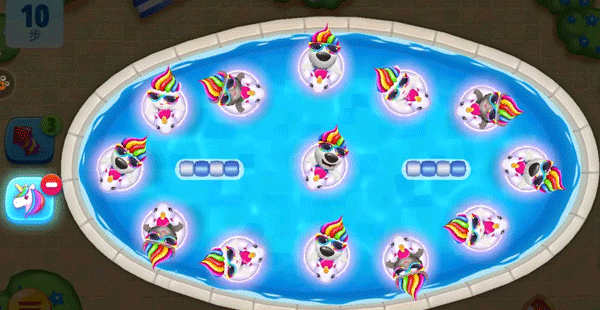独角兽也是个强力的道具,因为它能暂时把整个泳池里的角色统一变成白色,碰到让你减速的污水时也不会减速!不是同类也能在轻松全部消除!建议大家在变换颜色关和一些人物比较密集的地方使用,这样效果最好,你将在14关见到这个道具!