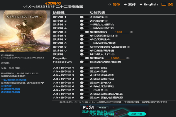 文明6二十二项修改器为各位领袖带来众多的修改器功能,无限的金钱,让你豢养大量的军队,不会财政紧张,收服满足,购买奢侈品,钱多的好处不需要我多说。还有一回合完成各种研究和市政,感兴趣的小伙伴,点击下载感受吧。