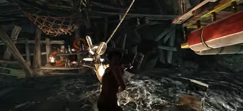 重新点燃火把,攀到木架上点燃白布,引燃油桶炸开通路。往前钻洞,遇到怪叔叔,用QTE挣脱他,不要啊不要!游出水洞到溪涧,空中吊着一只竹笼,用火烧断两侧的绳子,竹笼升高,另一道平台沉入水中,被河流冲下来的箱子木桶堆集上面,过去将它们点燃。爬到脚手架跳到空中的竹笼上,燃烧的木桶被倾倒在右边铁笼里,推掉铁笼将燃烧的箱子木桶倾泻到前方,引燃油桶炸开通路。