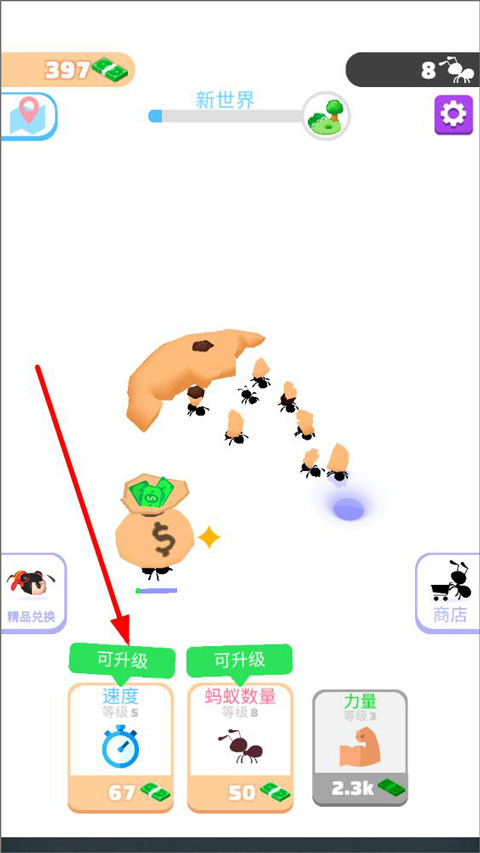 2. 点击“升级蚂蚁数量”,玩家便能看到游戏里蚂蚁的数量增多。