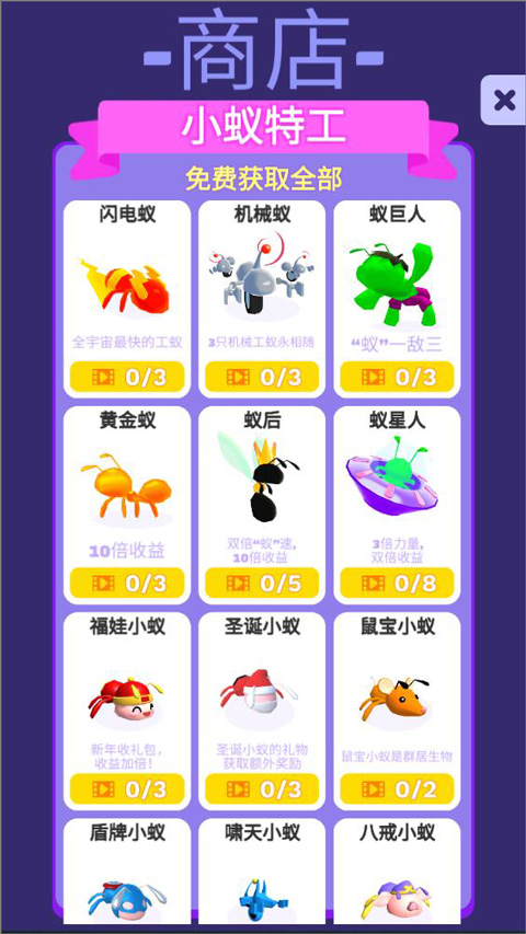 4、于商店页面里,玩家能够用游戏所赚取的钱来购置小蚂蚁特工。