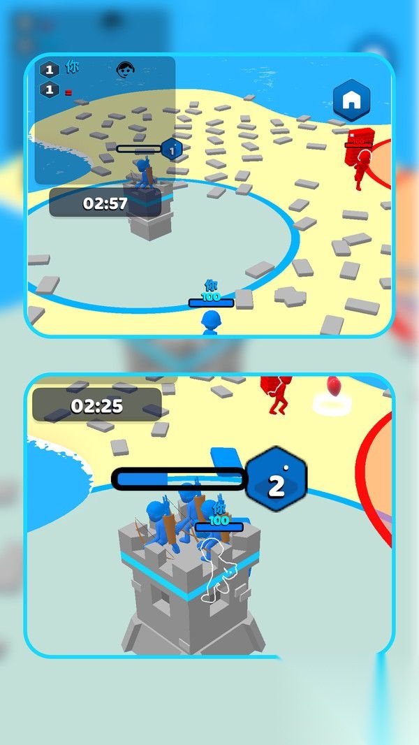 1、留意两个分屏战场的情况,关注倒计时(如【02:57】【02:25】),合理调配兵力,进行据点的防守或进攻。