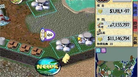 3、选项栏可以欣赏游戏的bgm音乐,并决定行走速度和是否退出、投降;自动运行是在玩家有事出去时,由电脑自动接管玩家控制的角色并继续游戏;出售栏可将自己的土地、股票、道具、卡片出售,并由其他玩家买走;股市可购买股票盈利。