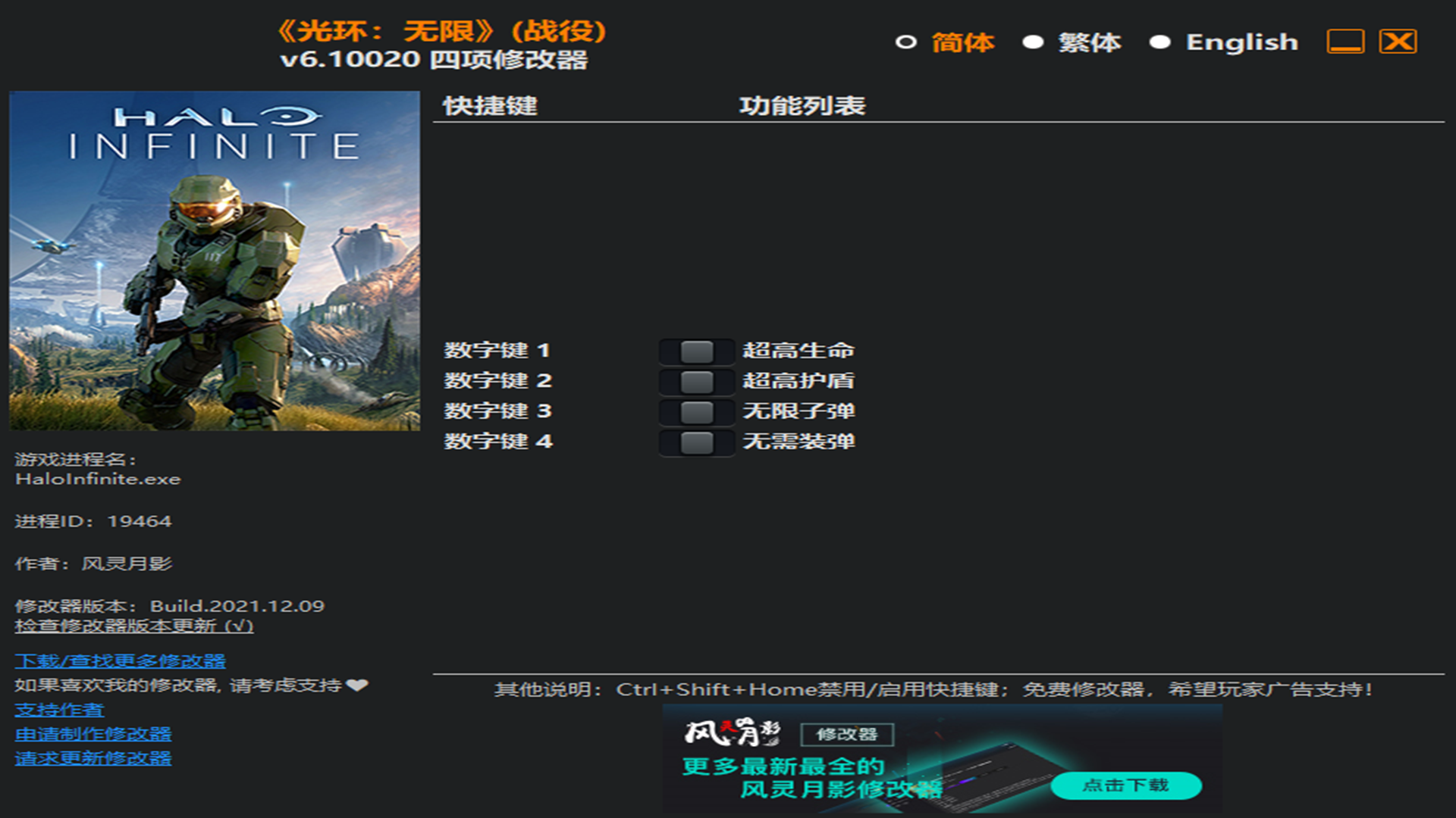 光环无限四项修改器功能分别是超好的生命值,让你绝对不会阵亡。超高的护盾值,不会有敌人能伤到以分毫。无限的子弹,搭配无需装弹的动作,让你可以实现全火力的覆盖,治愈你的火力不足恐惧症。喜欢的小伙伴,点击下载感受吧。