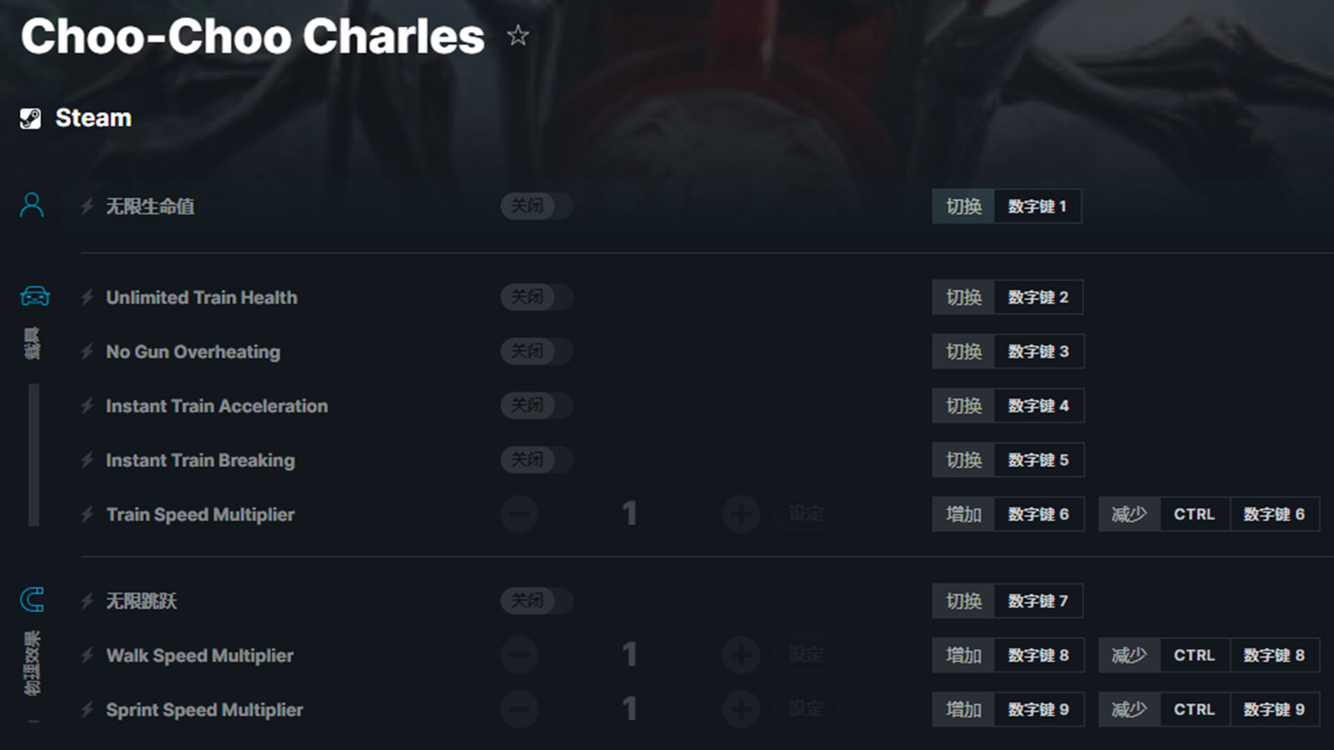 小火车查尔斯多功能修改器是一款基于wemod为玩家展现的一款九项功能的修改器,玩家将在不在害怕游戏中的各种恐怖场景,修改器将会是你相当强大的助力,完美展现出,科技对战力的加成,喜欢的小伙伴,点击下载感受吧。
