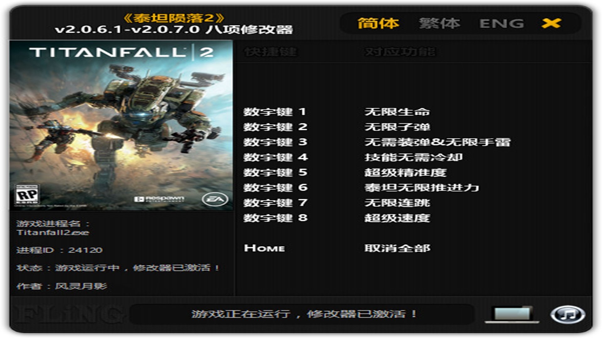 泰坦陨落2八项修改器为大家提供在游戏中无限的连跳,各种技能没有,冷却时间,也就是说,可以不间断,无限制的放技能。当然还有无限的子弹,相互之间的搭配,进行火力的全覆盖,喜欢的小伙伴,点击下载和感受吧。