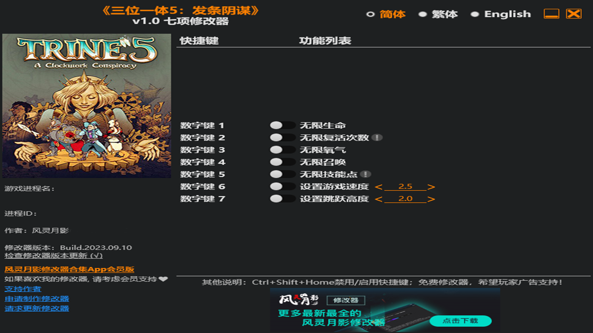 三位一体5修改器拥有七项功能,玩家可以获得无限的生命,角色没有体验感,能开启无限的复活,不会对游戏玩法造成毁灭性的打击。除此之外,可以自由设置在游戏中跳跃的高度,非常的惊喜,喜欢的小伙伴,点击下载感受吧。