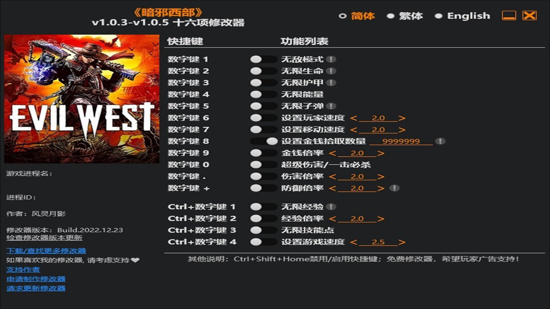 暗邪西部修改器十六项为玩家在游戏中进行一场相当精致的玩法,自主设置金钱的倍率,掉落的捡钱可以成倍的拾取。各种经验,技能点,子弹,能量,都是无限的,无尽的。你将获得极大的游戏自由度,不受各种限制,喜欢的小伙伴,点击下载吧。