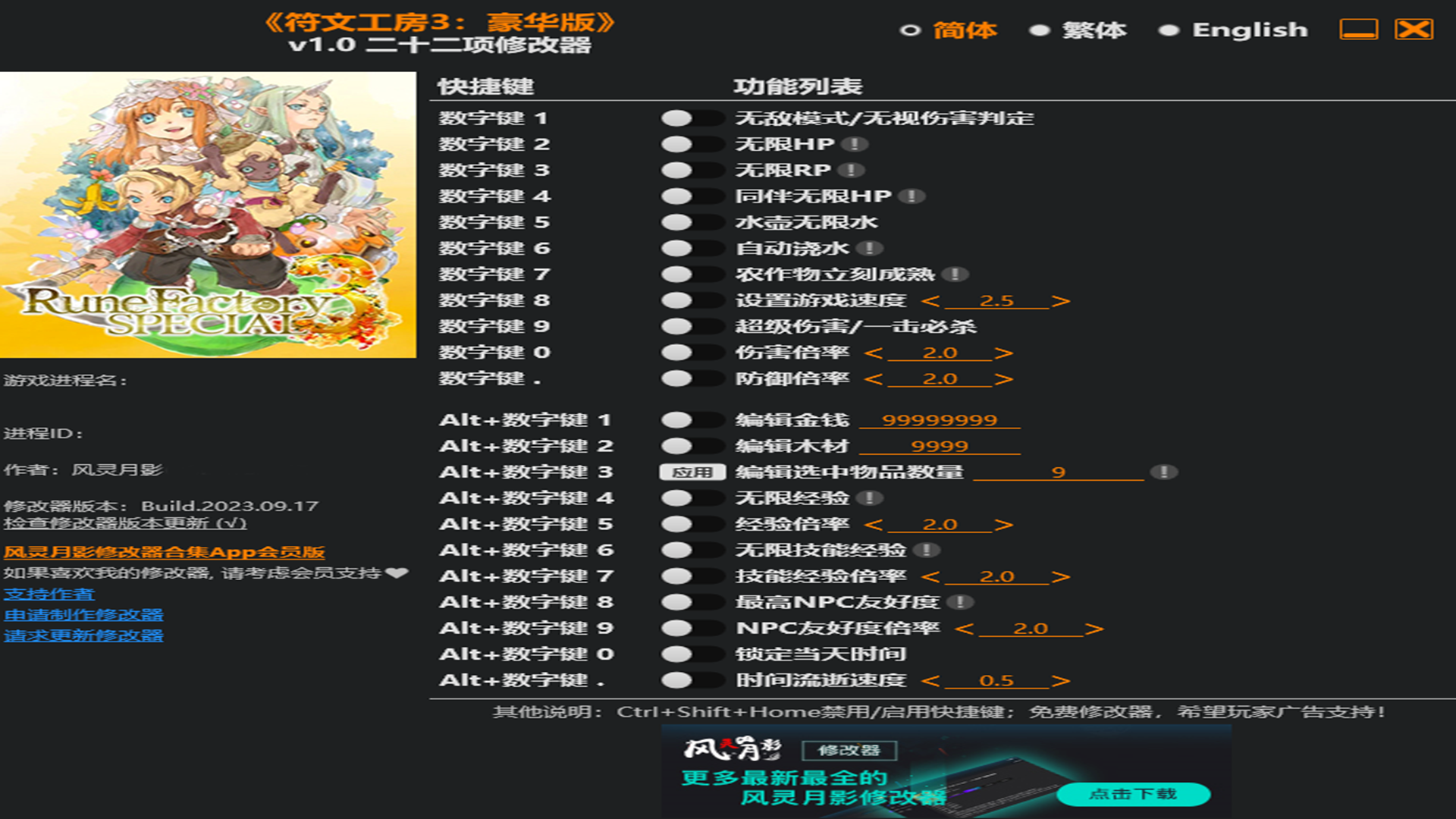 符文工房3修改器为各位农场主提供相当节约时间的修改功能,可以一键自动浇水,各种农作物都能一键催熟,是不是很方便。战斗方面提供一键秒杀的功能,绝对简单。喜欢的小伙伴,点击下载感受吧。