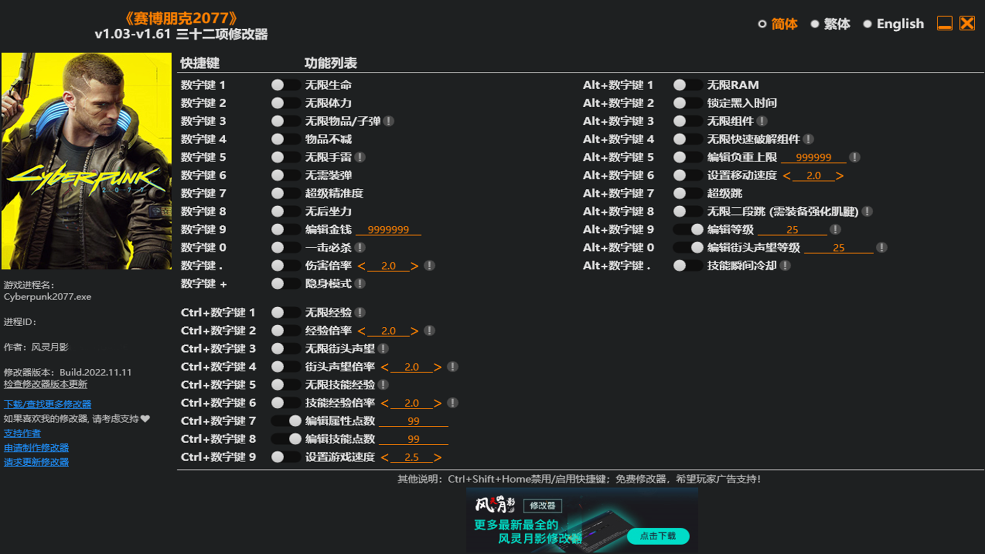 赛博朋克2077修改器(32项)让大家在未来科幻都市风格的游戏中获得更加强力的助力,修改器能为大家提供不死不灭的身体,无限的生命和体力。各种物品随便用,一点都不会减少,相当的精彩,喜欢的小伙伴,点击下载感受吧。