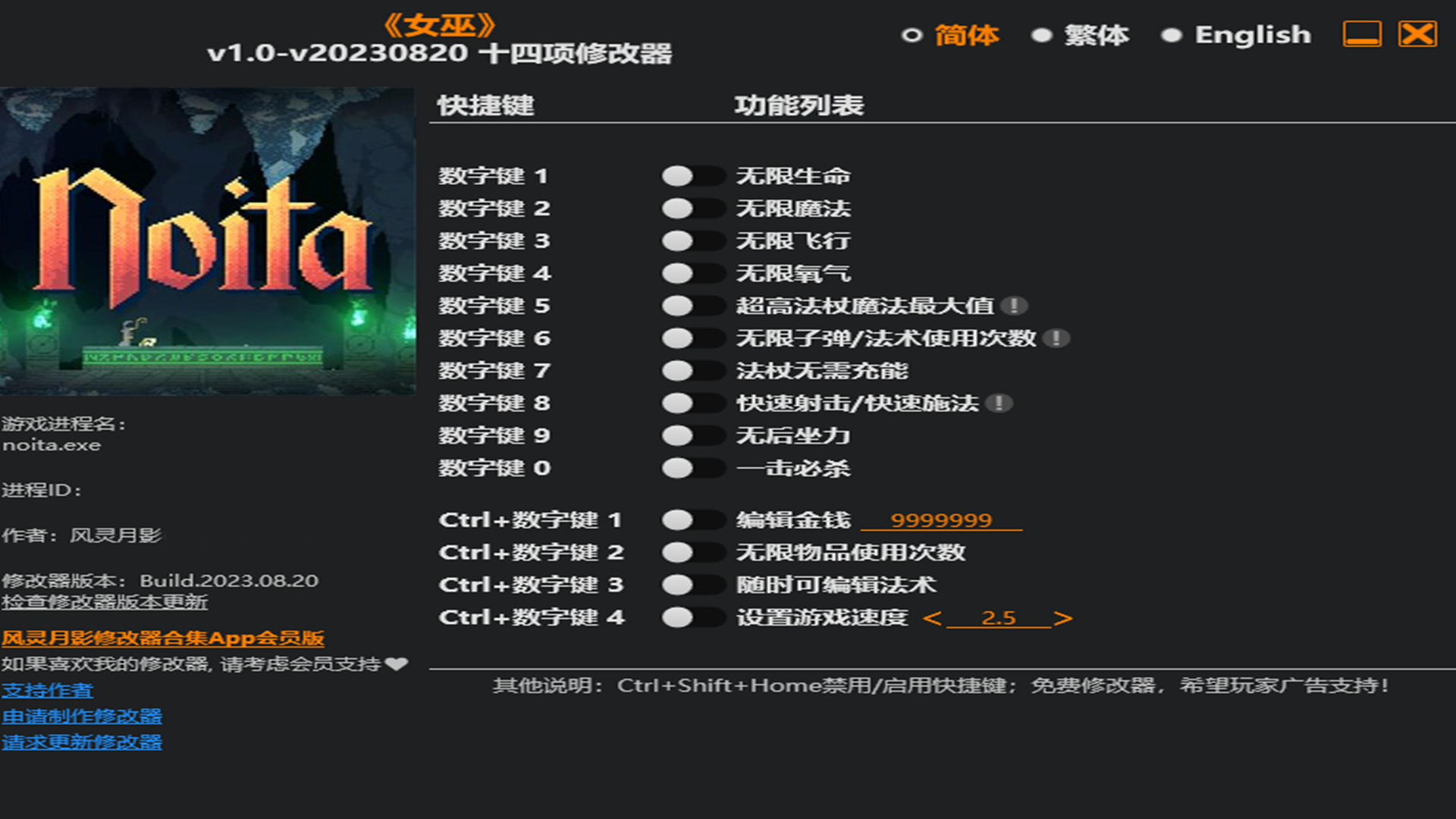 女巫(Noita)修改器是一款风灵月影制作的修改器,玩过这款游戏的小伙伴,明白在没有强大起来之前,探索这方世界是多么危险的一件事情。修改器为大家提供无限的生命和魔法,随意的飞行,没有限制,魔法杖不需要充能,喜欢的小伙伴,点击下载感受吧。