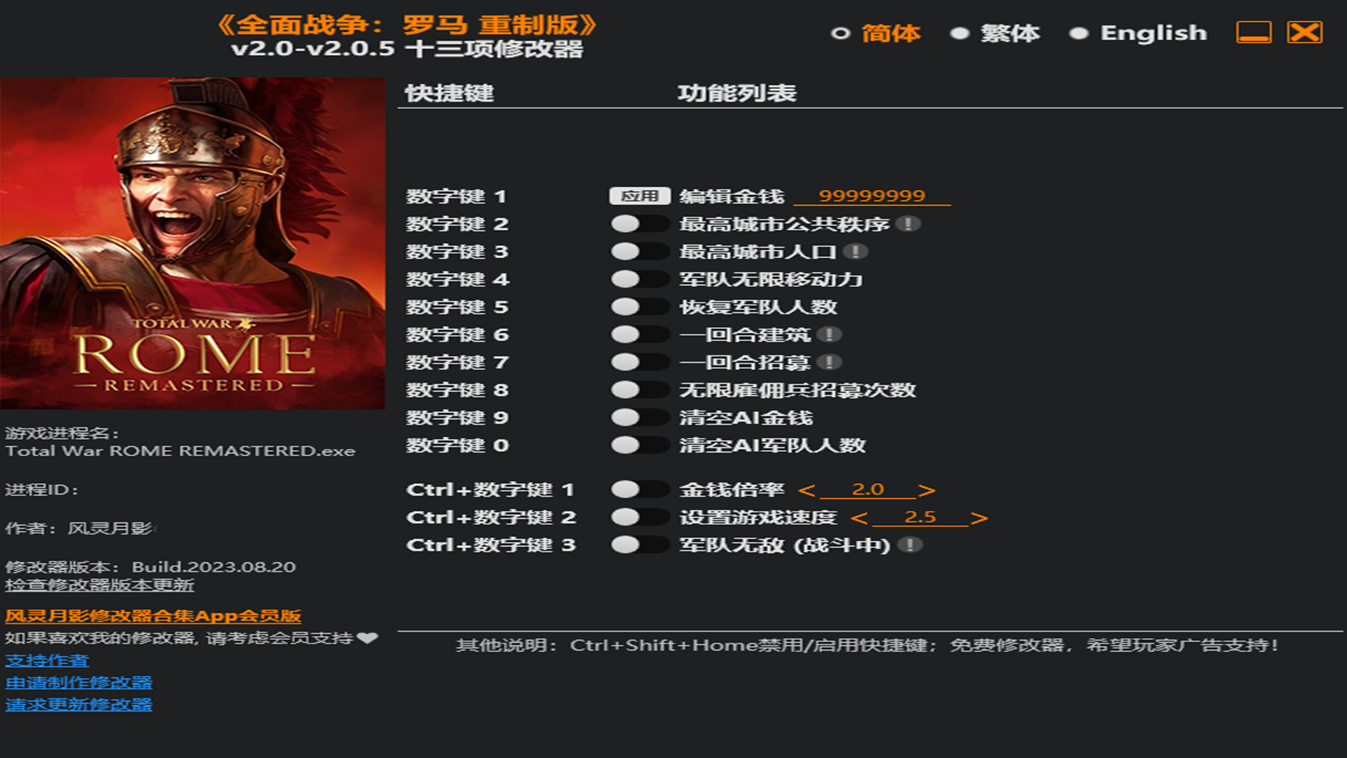 罗马全面战争修改器帮助给为凯撒大帝建造自己最强大的罗马,通过相应的按键,直接修改游戏世界的运行法则,让城市获得最高的人口,各种建筑都是一回合完成,军队拥有无限的行动力,喜欢的小伙伴,点击下载感受吧。
