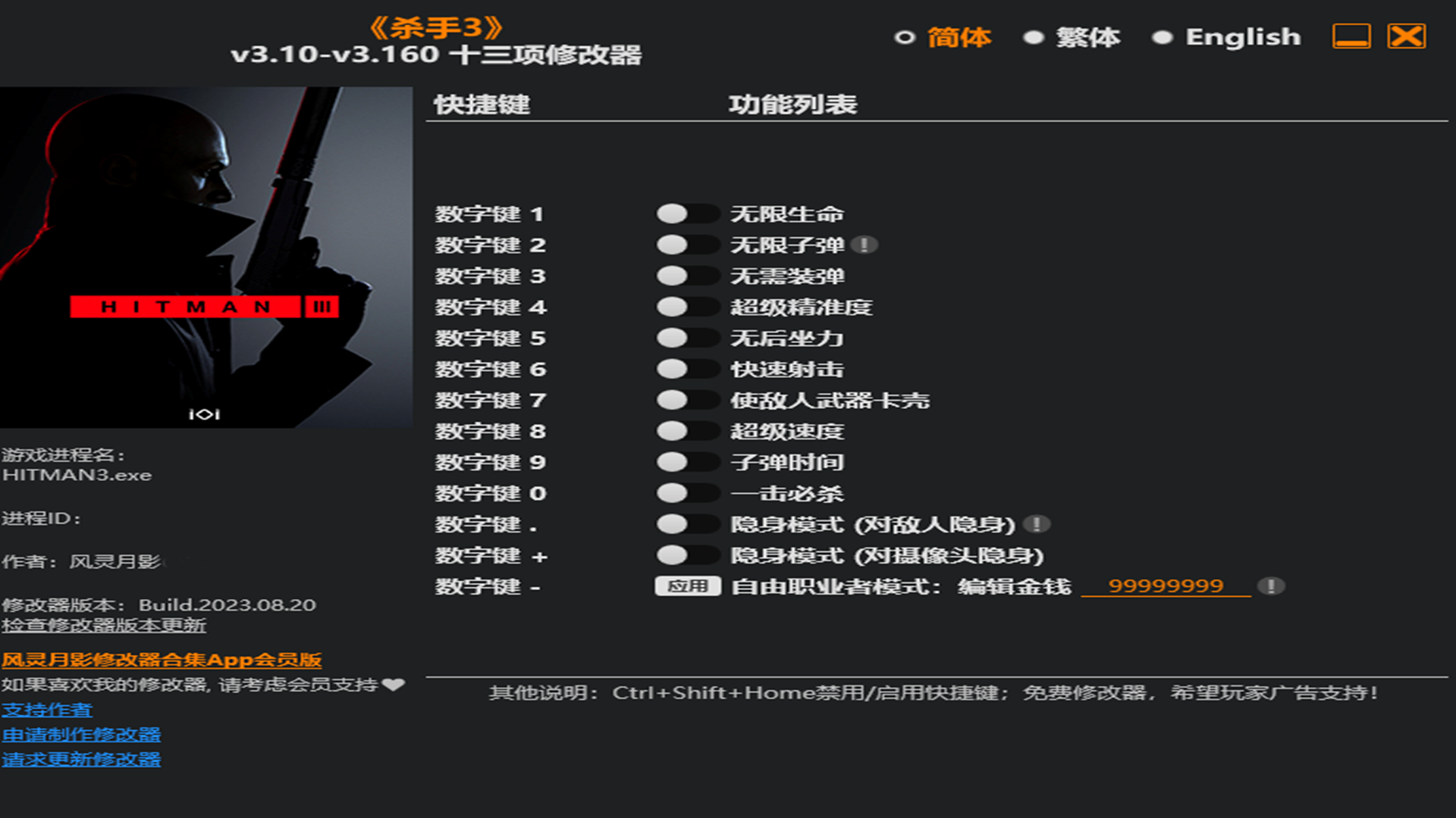 杀手3修改器让你可以一键进入隐身模式,获得极快的超级速度。在无形中进行快速的击杀。无限子弹是你的都蹲,无需装弹,和超级精准射击,为您的每一次猎杀做好最充分的准备,喜欢的小伙伴,点击下载感受吧。