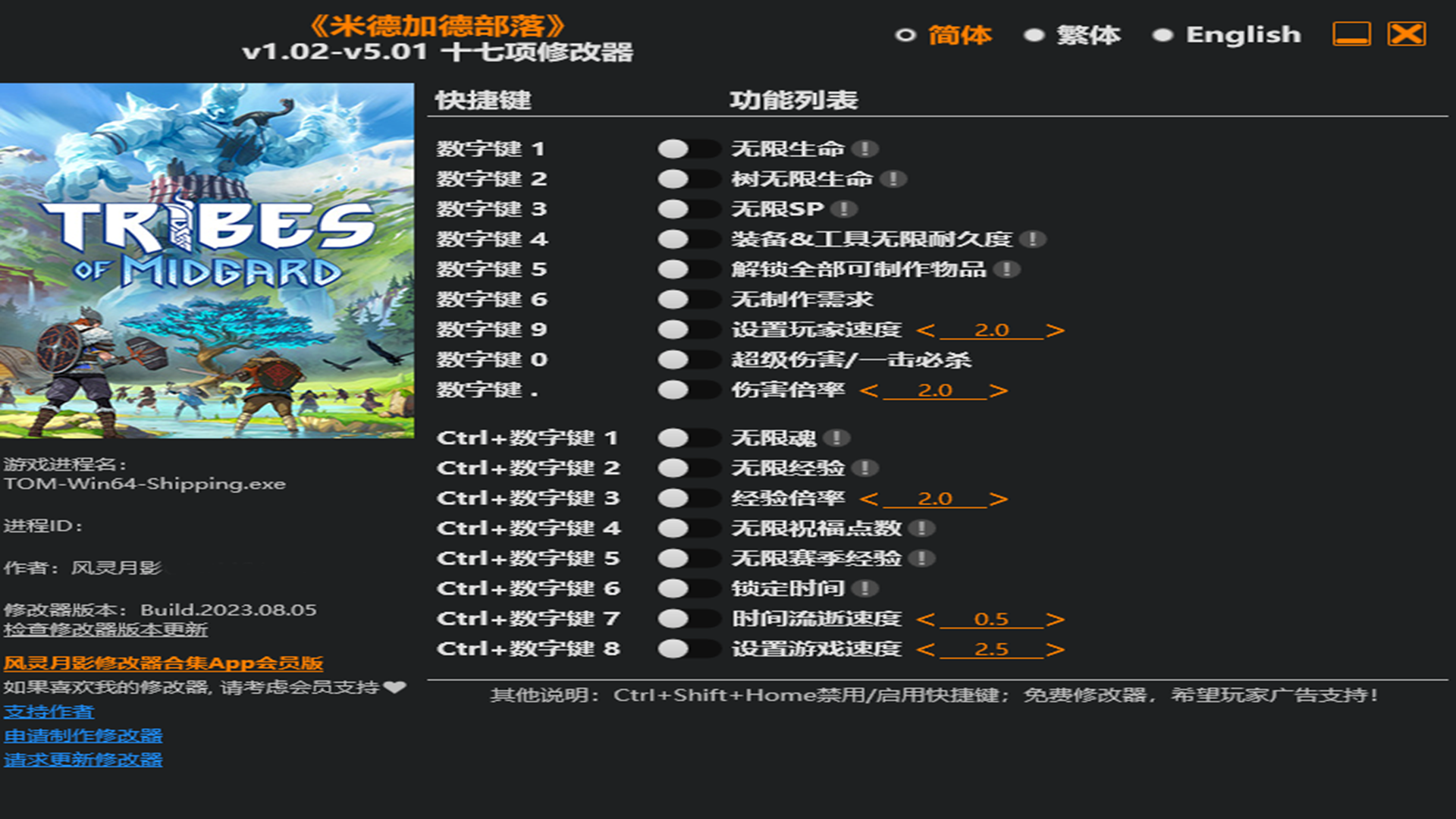 米德加德部落修改器拥有风灵月影出品修改器的独家技能,对时间的掌控,玩家可以通过Ctrl+6一键锁定时间,还能Ctrl+7设置时间的流逝速度,成为时空掌控者,此外还有十五种功能等你发掘,喜欢的小伙伴,点击下载感受吧。