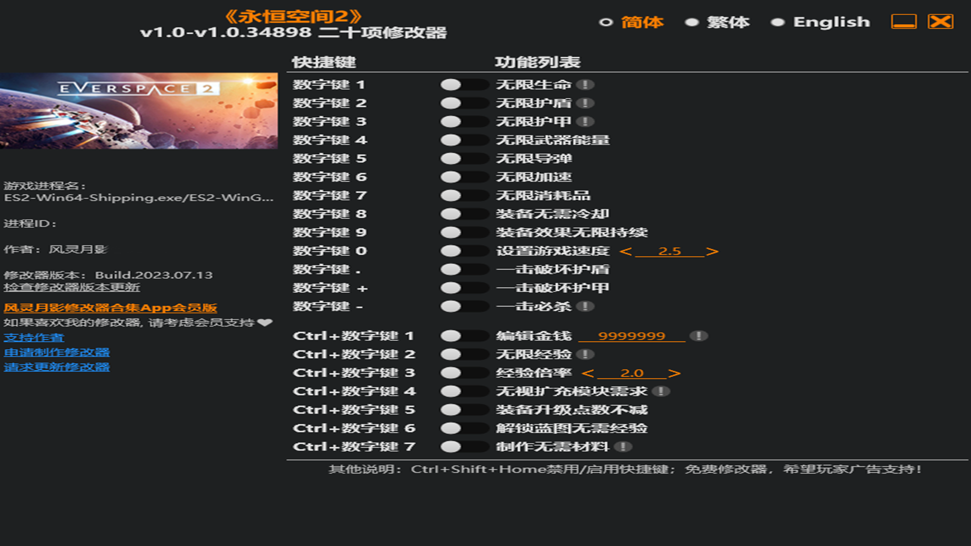 永恒空间2修改器将会是玩家探索宇宙,征服银河系的一把利剑。提供无穷无尽的消耗品,各种技能和装备没有冷却,你是无限的护盾值,却能把对手飞船的护盾击破坏,非常的强大,喜欢的小伙伴,点击下载感受吧。
