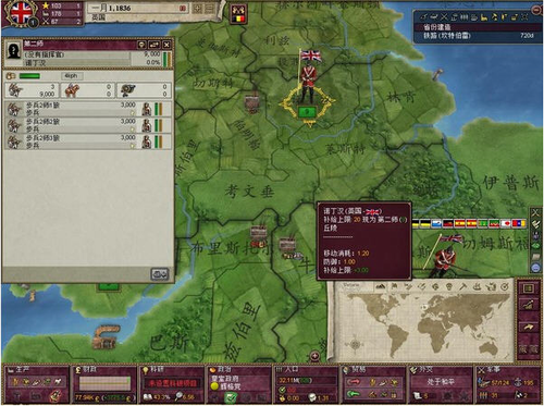 4.星际争霸里面有一种操作叫做地毯式空投,原理用在VIC2就变成:当你对抗一个大国(数不清的省市)是,在占领不要合并你的军队,而是向一处进军,然后取消对大军中几对部队的选择(点部队窗口的小叉,别点到骷髅了),然后剩余人马去下一个地点,简洁高效。