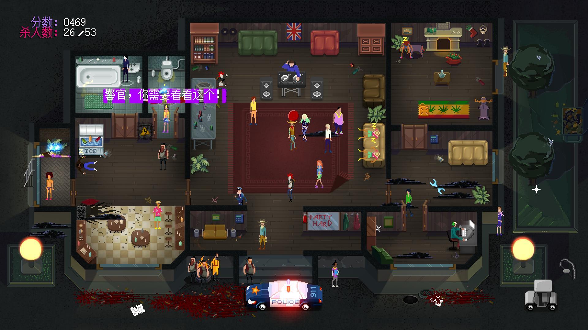 然后我说说忍者的玩法,开始先往特种部队和保安群里丢烟雾弹,杀完就别动了,等警察处理完在动,之后靠烟雾弹把全场杀掉我就不说了,我还是比较推荐用忍者的,但忍者操作难度较高。