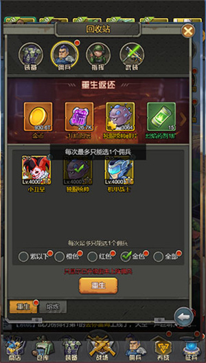 佣兵可在回收站进行重生,佣兵重生会返还花费在佣兵身上的所有金币,只有未上阵的佣兵才能重生,佣兵重生不需要消耗其他材料。