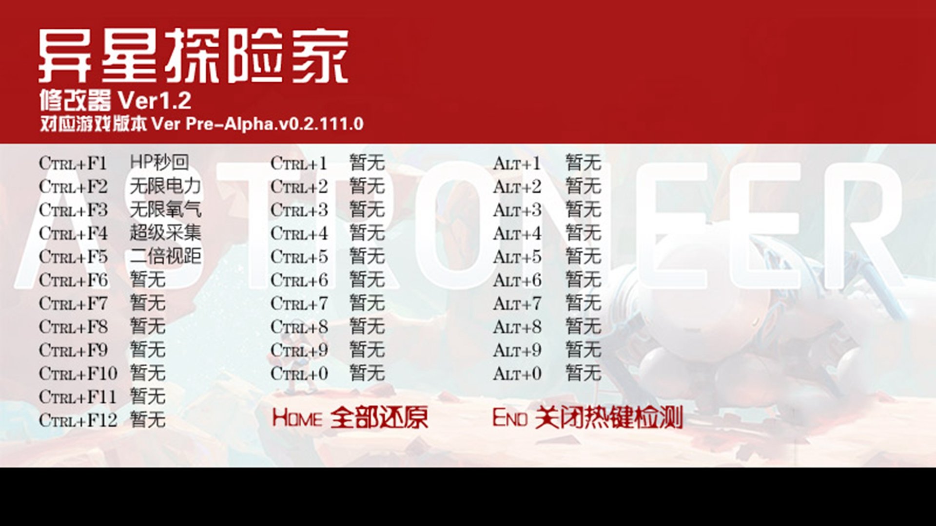 异星探险家修改器给大家相当惊喜的全新玩法,这里你不仅可以获得无限的电力,保障能源的永不短缺。此外还能提供无限的氧气,保障在任何星球都能安稳度日。还有辅助性质的超级采集和二倍视距,帮助你更好的探索异星球。