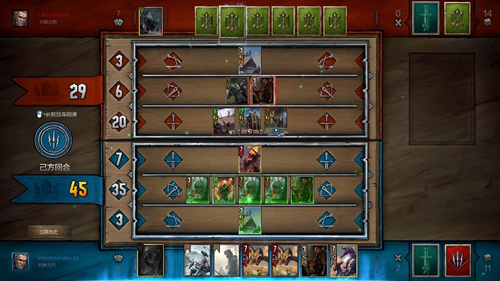 4、一小局游戏中,双方轮流出卡,一次一张,只到一方没卡或者主动按空格键结束出卡时一小局结束并开始清算力量点数。