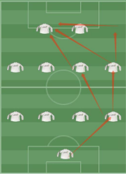 简单总结,右边发起进攻,传球给左边,左边完成射门。 同理左边反过来。中间出球给中场,中场倒脚自己打门或者给前锋射门。