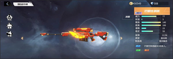 巴雷托 - 朝凤作为一把神话级狙击枪,威力值高达77点,然而其便携性欠佳。此外,玩家若想获得这把神话级武器,只能通过抽取,而抽取结果全凭运气。要是玩家钟情巴雷托枪型,却未能抽到神话级的,还有一把卓越级巴雷托可供选择。它的威力值仅比神话级少1点,为76点,而且在造型方面,也不如神话级那般美观。