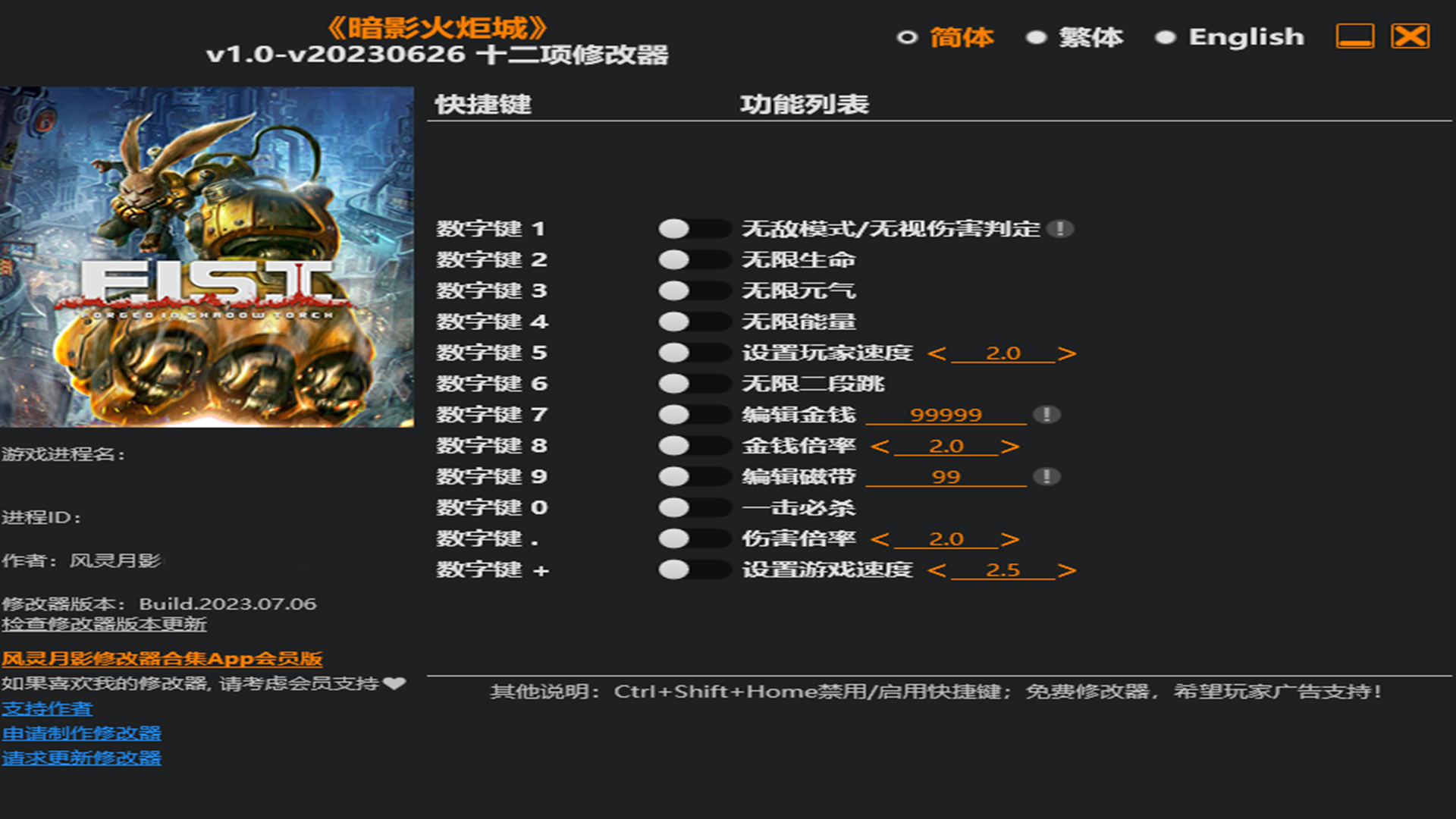 暗影火炬城修改器(风灵月影)为大家提供十二项修改功能,针对自身状态,提供无限元气能量和生命。针对各种资源,提供无限的金钱和磁带,可以随意的更改。超乎限制的作用还有一击必杀和游戏速度,无限二连跳等等。喜欢的小伙伴,点击下载吧。
