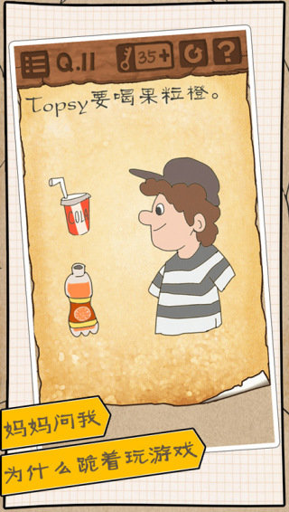 8、按住橙汁晃动手机,然后把橙汁拖向Topsy【喝果粒橙前要摇一摇】