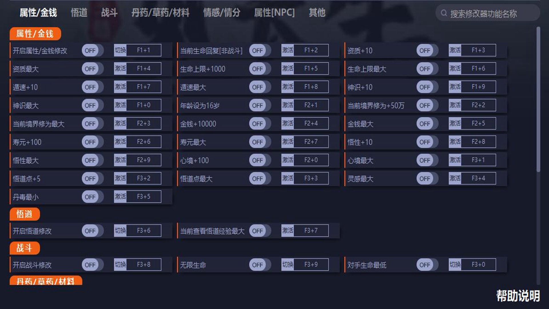 3.开启修改器各主初始项再使用各子修改项[无主初始项则不用开启][主初始项:如开启...修改]。