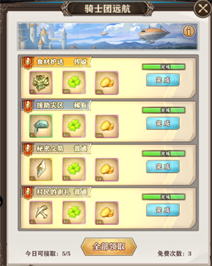 远航系统是骑士团的日常任务,玩家每日可接取5次,免费刷新3次。建议玩家在接取之前先看清楚奖励是否是自己中意的,接着再通过每日提供的刷新机会进行筛选接取。