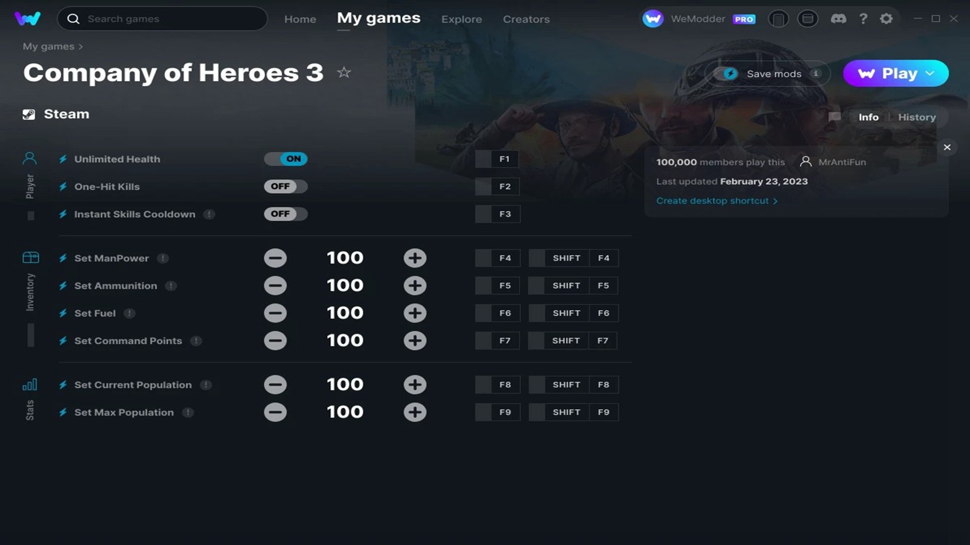 英雄连3九项修改器是一款配合wemod使用的修改器,安装之后,使用更加方便。功能十分多样,为大家提供无敌模式,无限的血量,不用担心会别击杀。还能做到一击必杀和无限子弹,让你在游戏中,化身英雄,喜欢的小伙伴,点击下载感受吧。