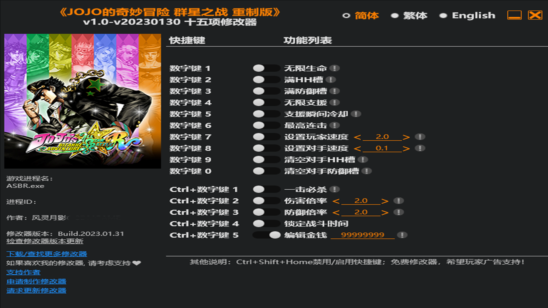 JOJO的奇妙冒险修改器风灵月影版包括无限支援、伤害倍率、无限生命、一击必杀、编辑金钱、满HH槽和无限支援等。这些功能对玩家有很大的帮助,可以根据玩家的需求选择开启。同时,这款修改器的应用体积较为小巧,不会占用用户过多的存储空间,使用起来也十分简便。