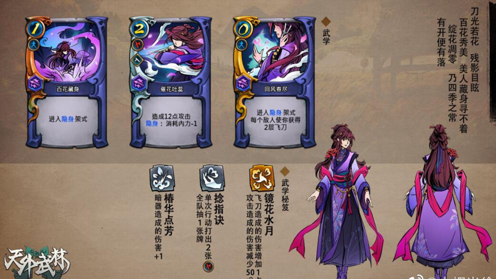 【百花藏身】:进入【隐身】。未强化是1费,强化后是0费。【绝技牌】拿来替换【藏花护体】。