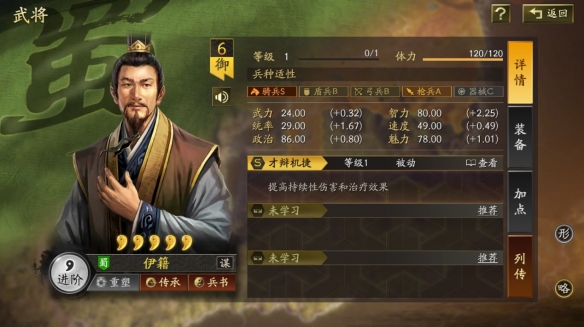 伊籍的自带战法【才辩机捷】可以提供强力增益效果,让伊籍施加的各类持续伤害状态伤害和治疗效果大幅提升。既可以携带四面楚歌、妖术等伤害类战法承担队伍的谋略输出,又可以凭借治疗的增幅,成为队伍的后勤保障,可谓才思迅捷,应变机敏!