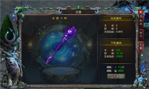 天雷生命加成,着重前期优先升级。通过消耗对应银币与狮眼石来升级法杖,能提升生命、防御以及生命加成属性。银币可经由回收装备获取,同时也能从免费会员礼包、开服活动、神殿商城处得到。