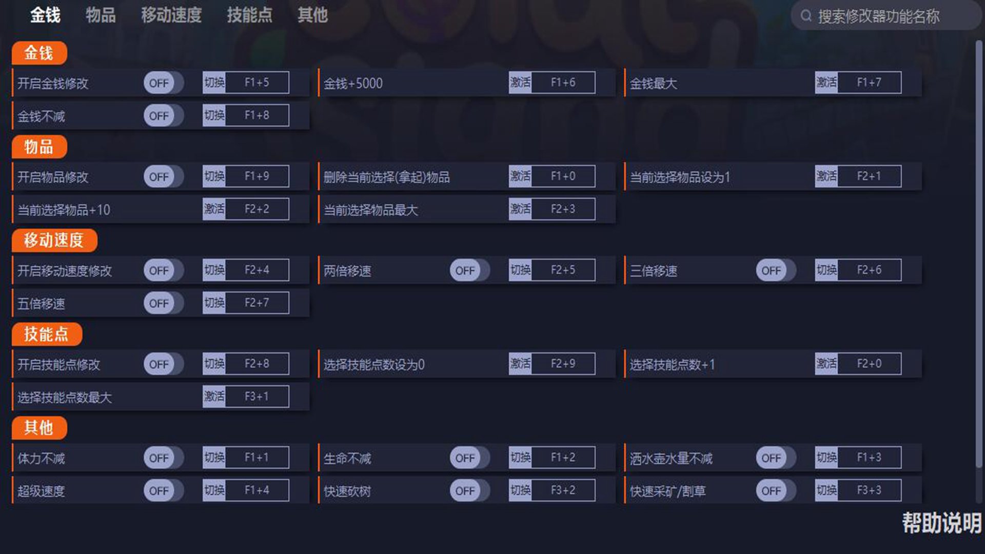 3.开启修改器各主初始项再使用各子修改项[无主初始项则不用开启][主初始项:如开启...修改]。