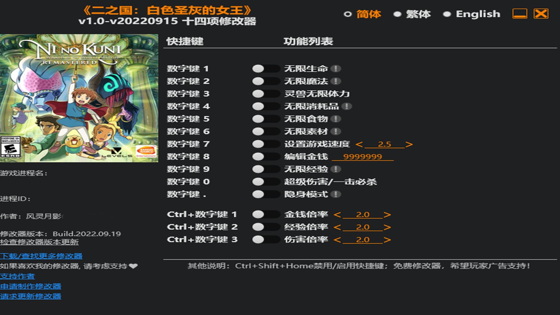 二之国修改器(风灵月影)为大家穿越到这款二次元的世界中,提供一个相当好用的金手指。化身游戏世界绝对的主宰,一键更好游戏世界时间的运行速度。此外,还能编辑金钱,经验以及各种倍率的数值,喜欢的小伙伴,点击下载感受吧。