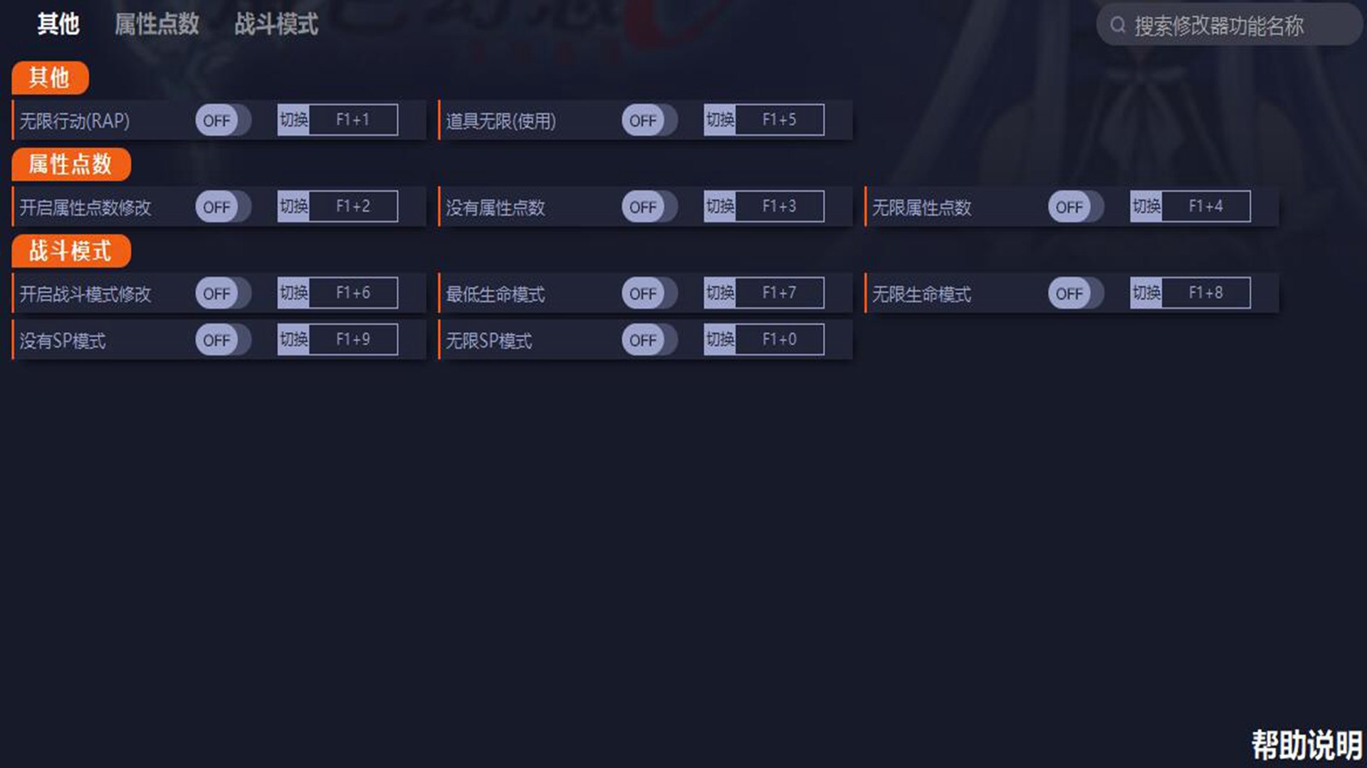 1.开启属性点数修改:开启后,战斗中打开人物状态界面使用(右键角色)。
