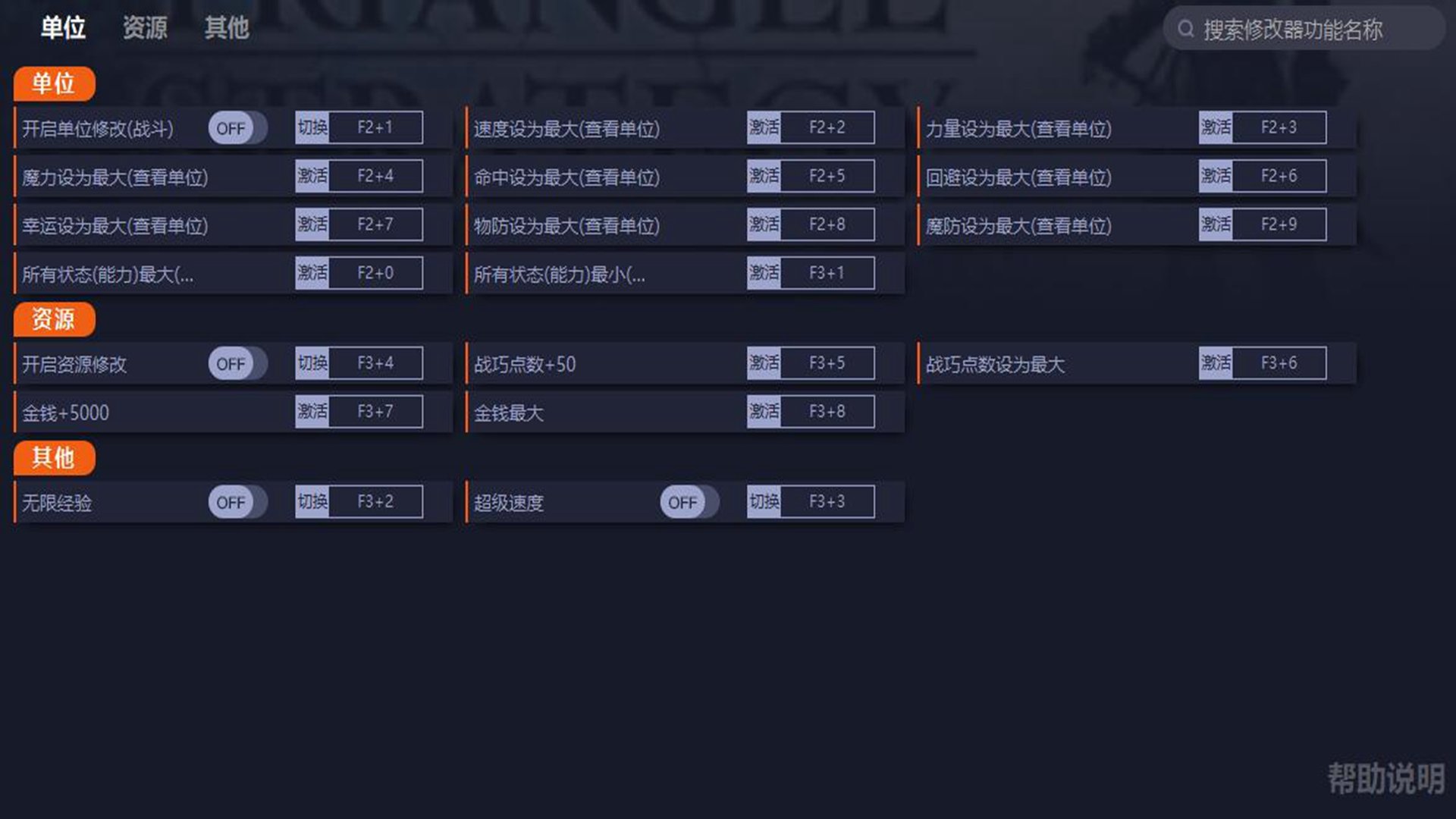1.开启单位修改(战斗):战斗中按W/A/S/D移至单位上,按TAB进入单位信息界面修改,升级或退出战斗重置。